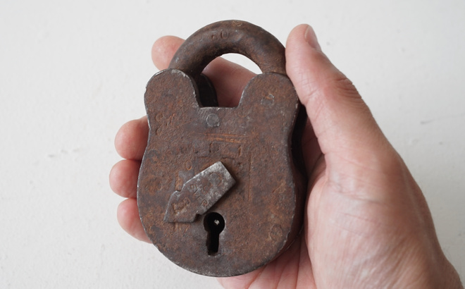 Antique Padlock - No.4 - No:OB-6163-4Size: H9.8cm x W6.3cm / 1800年代頃 , イギリス †鍵付き、施錠可能。 Price: 12,000-(税込)