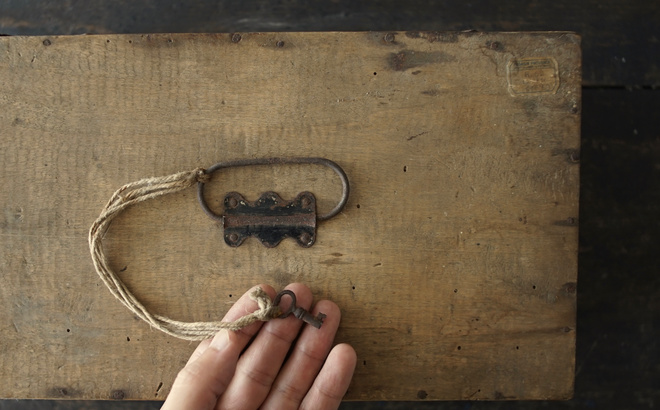 フランスの古い鍵付き木箱。鍵付きのものはなかなか見つからないもの。