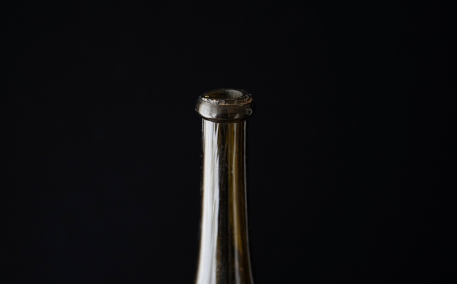 フランスの古いワインボトル。手に収まる持ちやすい細さとネック部分も長く美しいフォルム。通常のワインボトル750mlよりもひと回り小さな450ml。良いアクセントになっているガラスのシーリングも嬉しいデザイン。