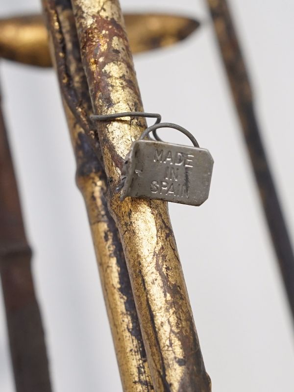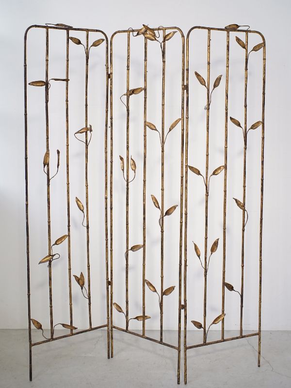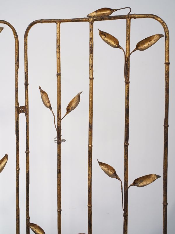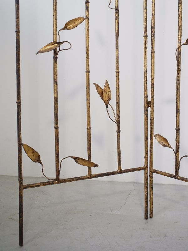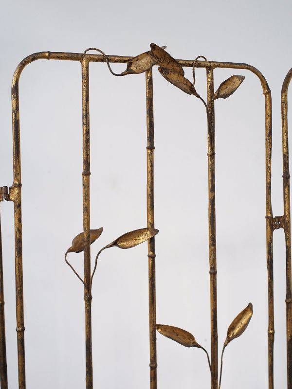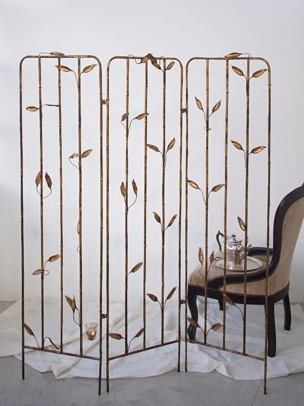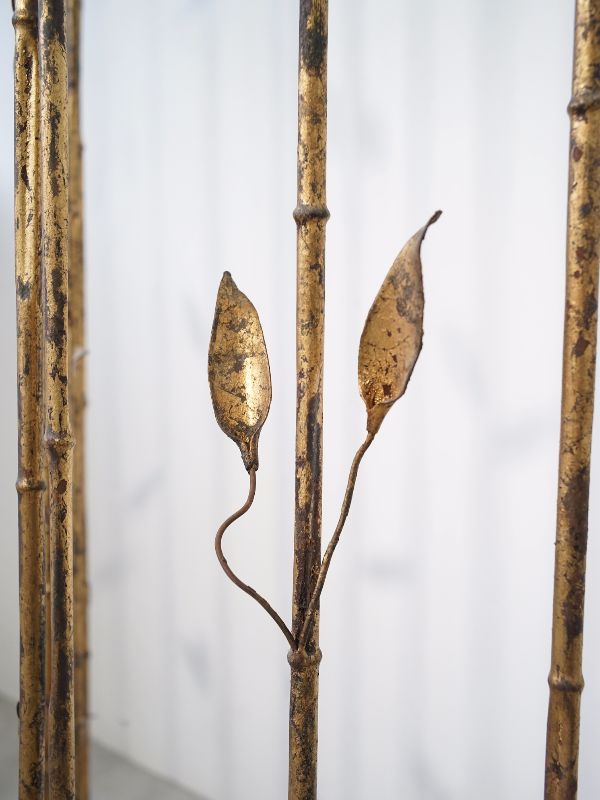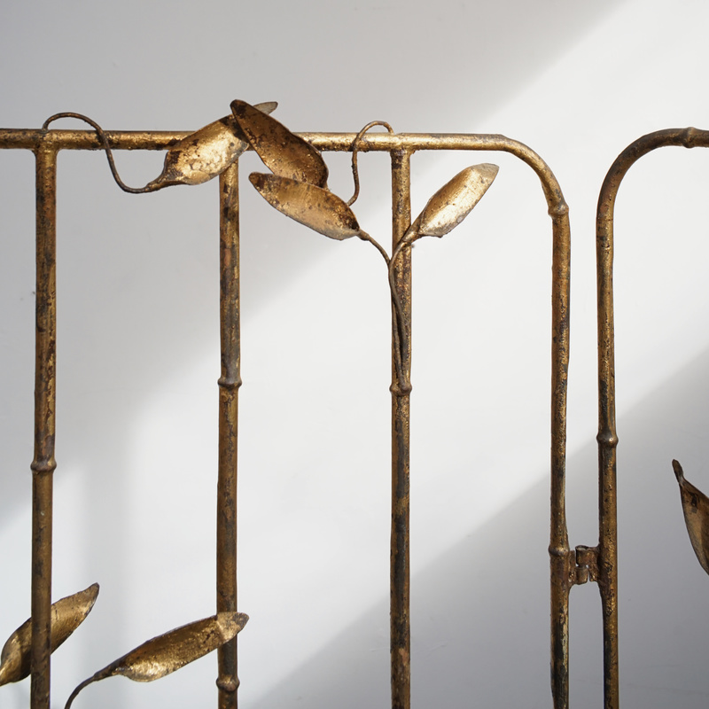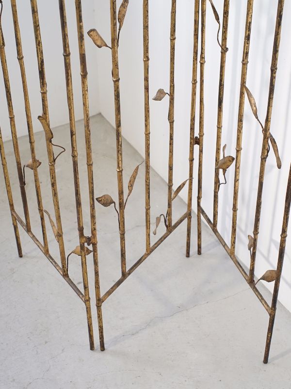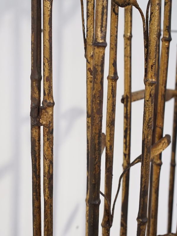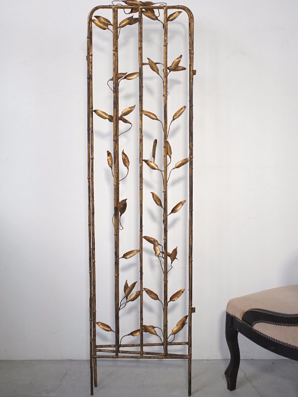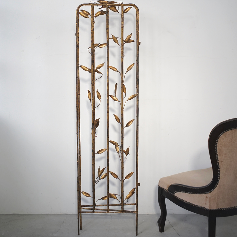 古い鉄製衝立、スペインのものでしょう。細い竹モチーフの枠にバランス良く散りばめられた葉と枯れたゴールド色が雰囲気良く美しい。