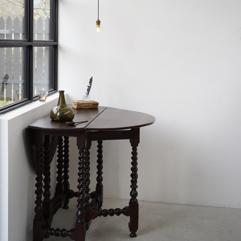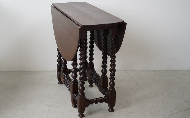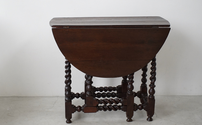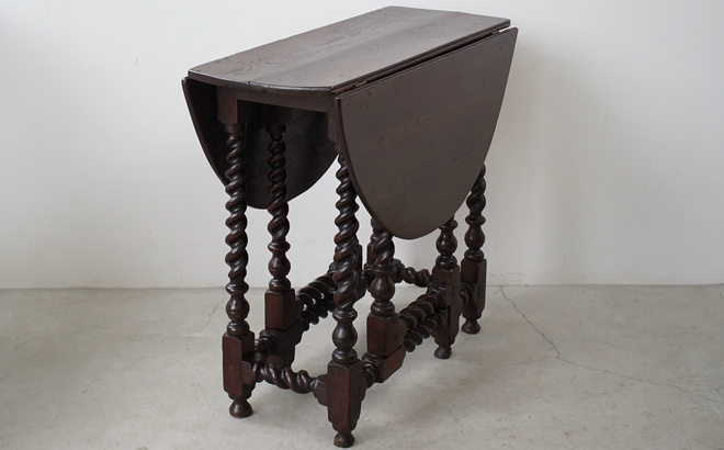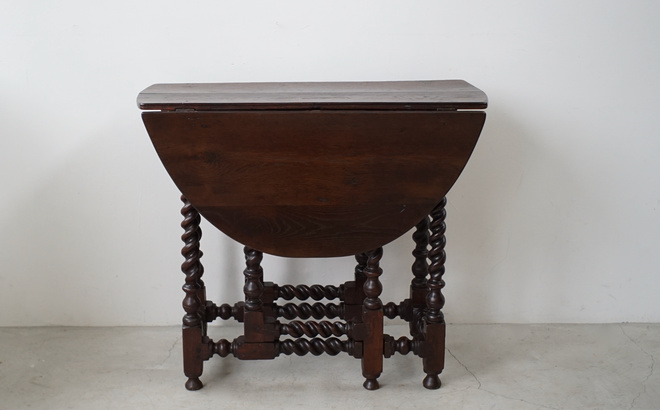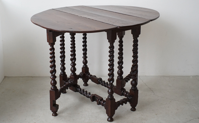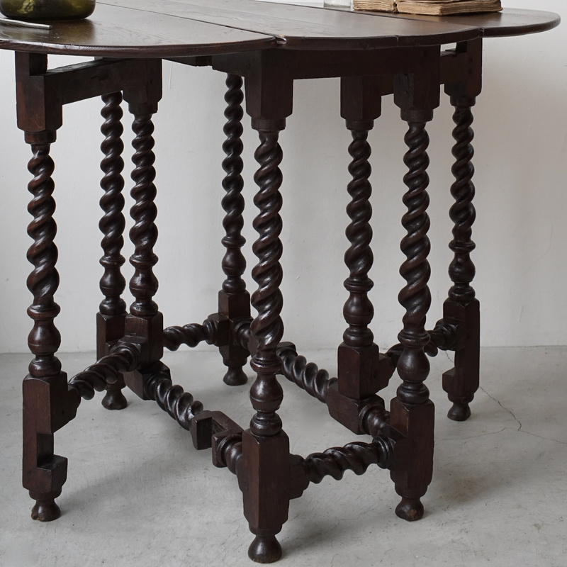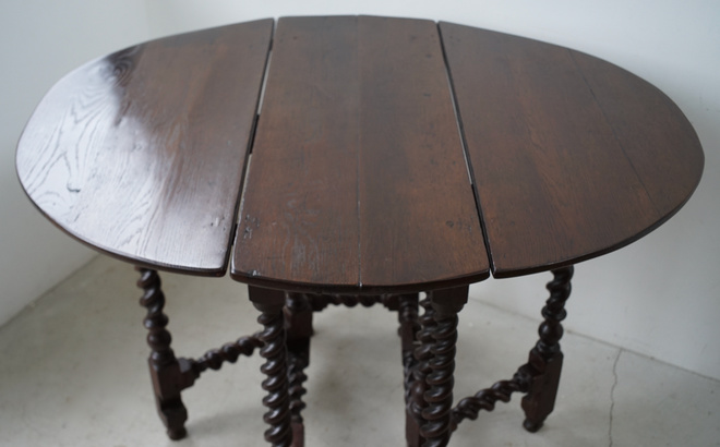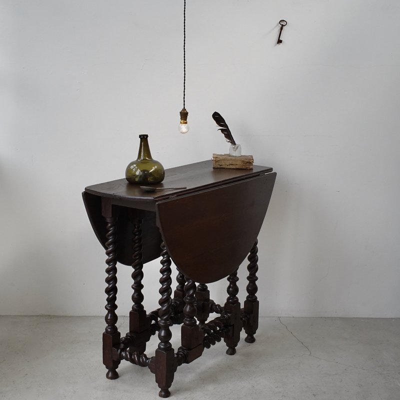 イギリスの古いゲートレッグテーブル。使い込まれた天板の表情、細かなツイストレッグも魅力的な一台。