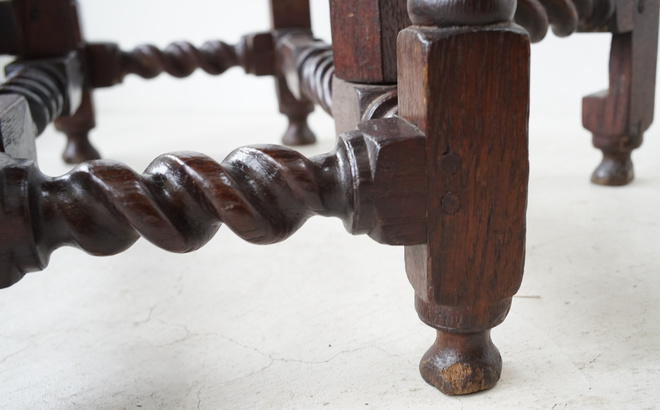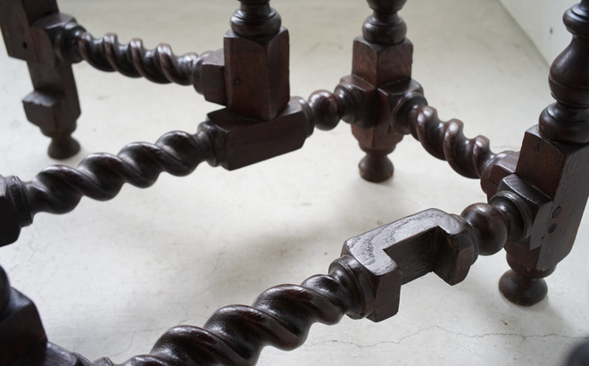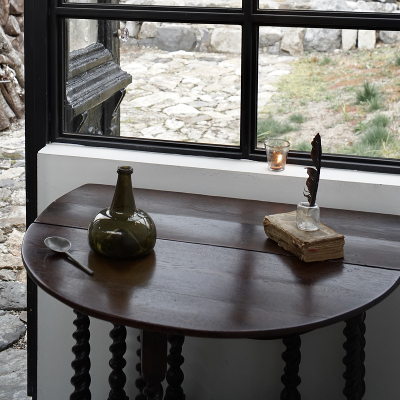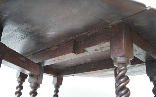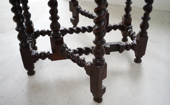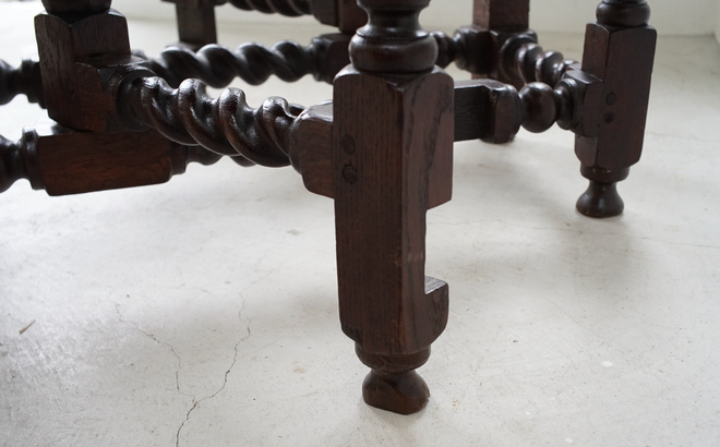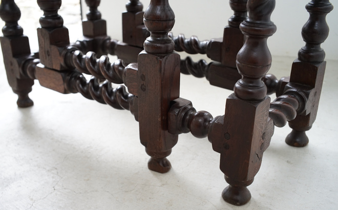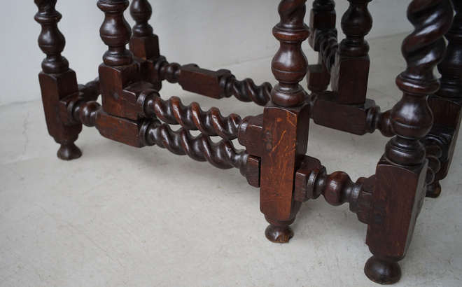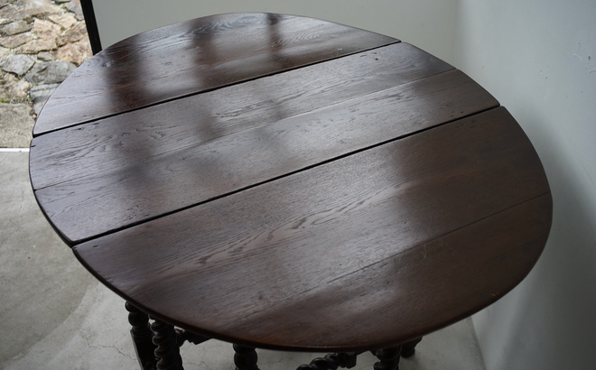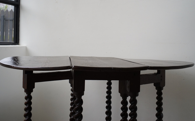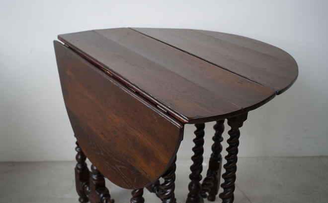 イギリスの古いゲートレッグテーブル。使い込まれた天板の表情、細かなツイストレッグも魅力的な一台。