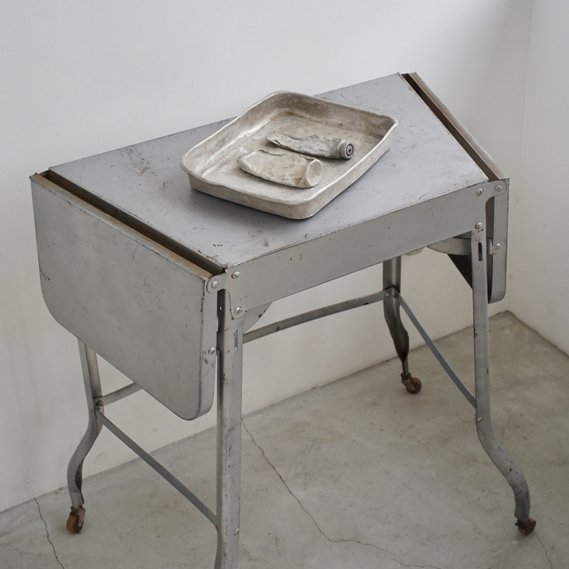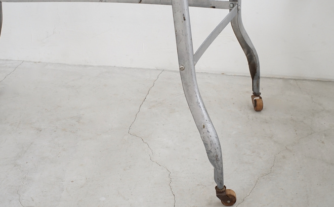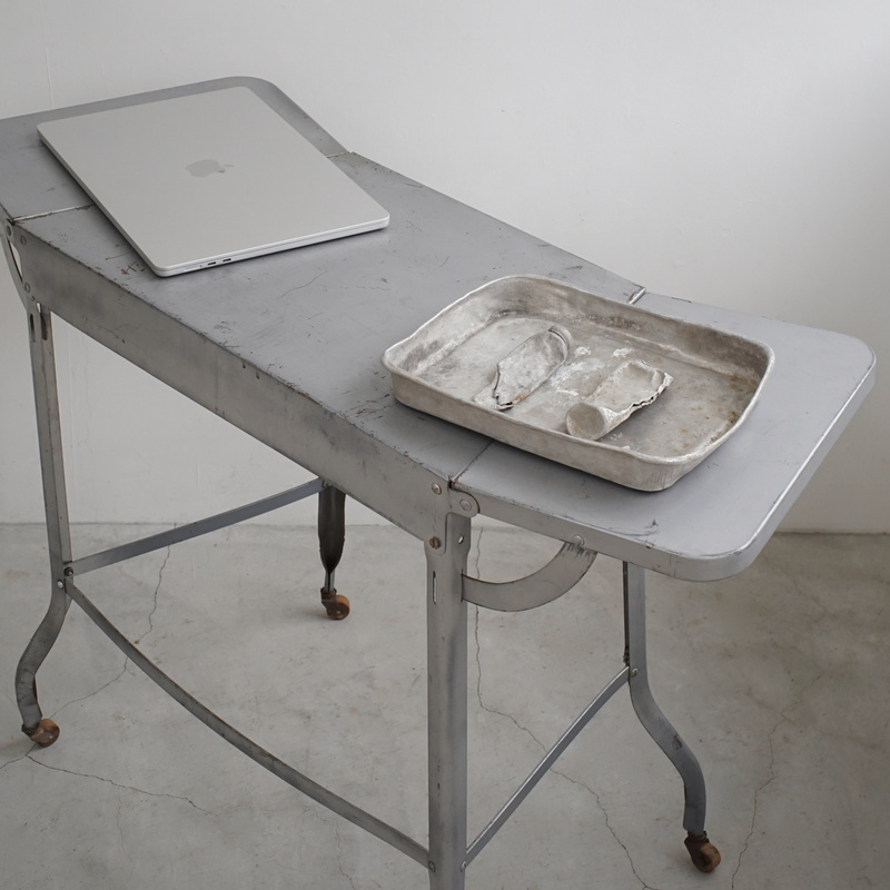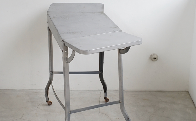アメリカのヴィンテージタイプライターデスク。体に沿う角度のついたバタフライ式の天板が魅力的。シャープさのあるフォルムに木のキャスターの組み合わせも良いディテール。