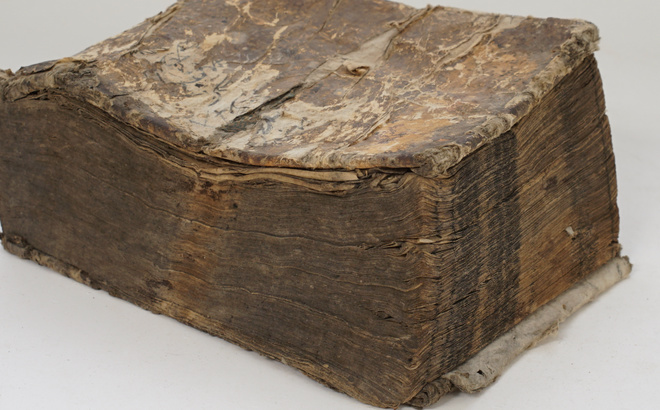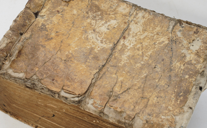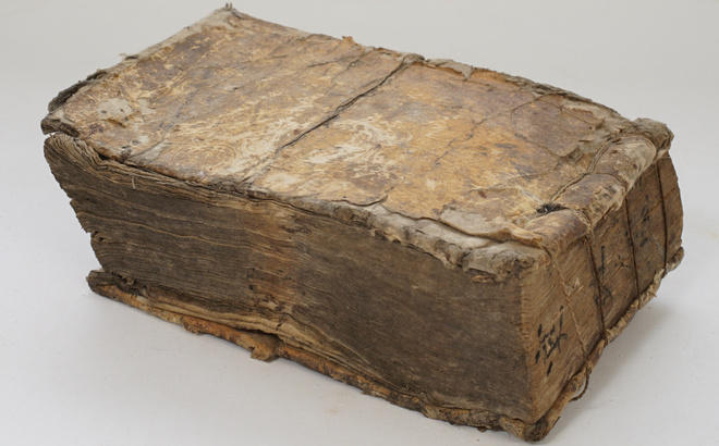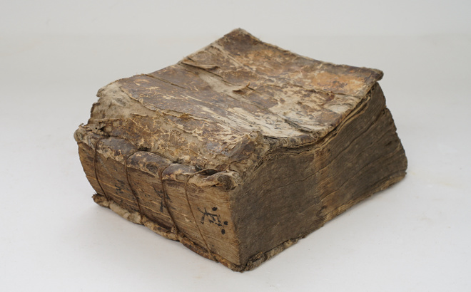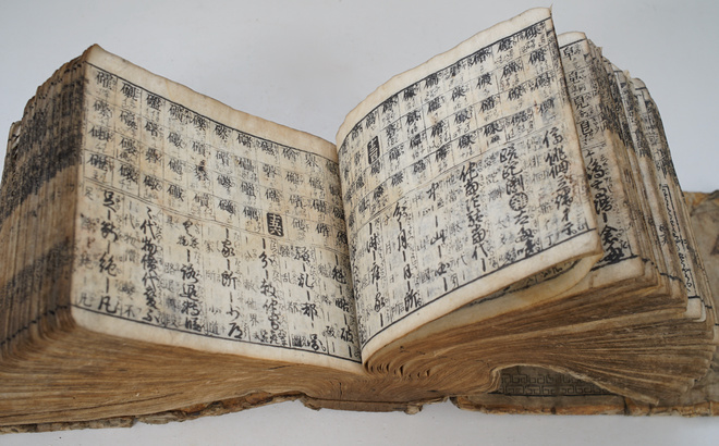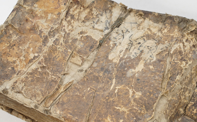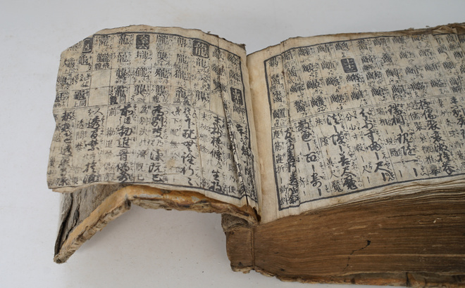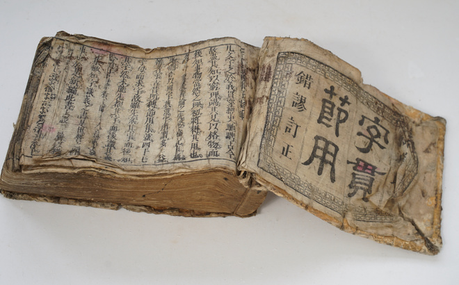 使い込まれた風合いが魅力的な和綴じの古書。江戸時代の漢字辞書。