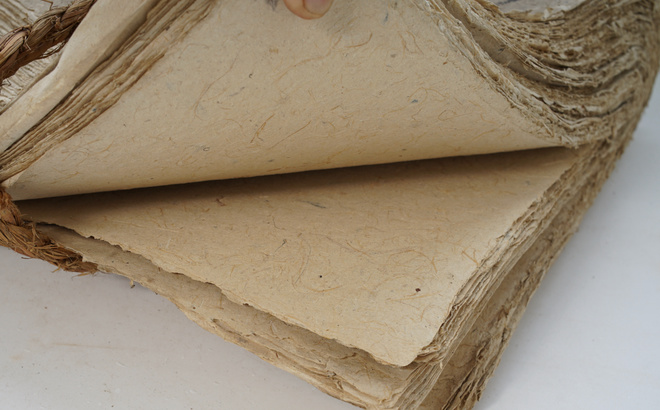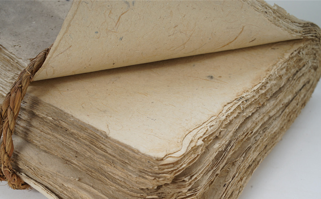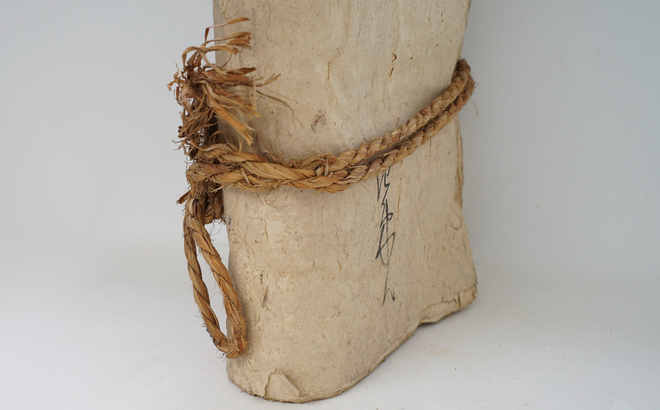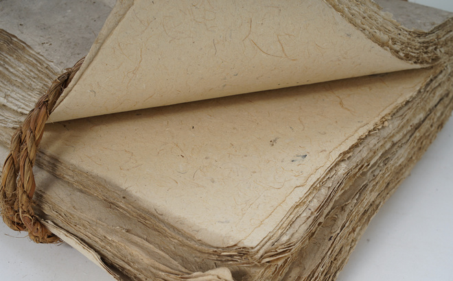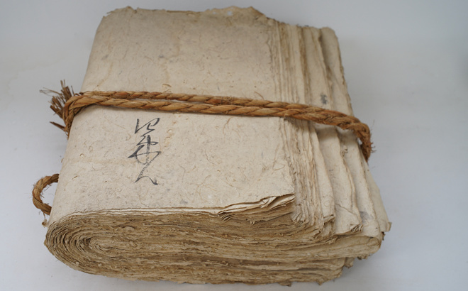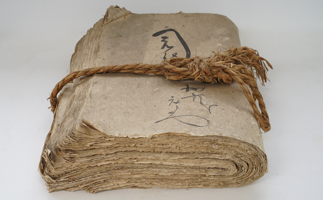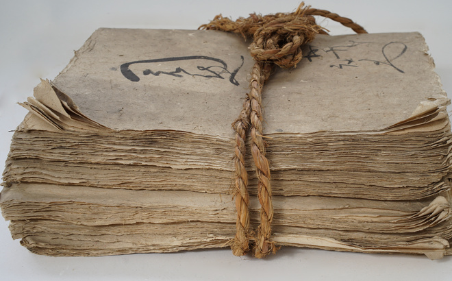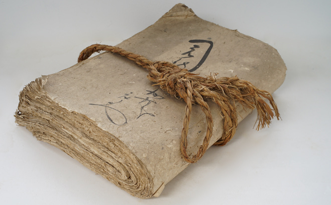 和紙の束感に藁紐が雰囲気のある江戸時代の冊子。表紙は百人一首についてのようだが中は無地のまま残された物。