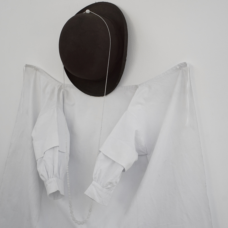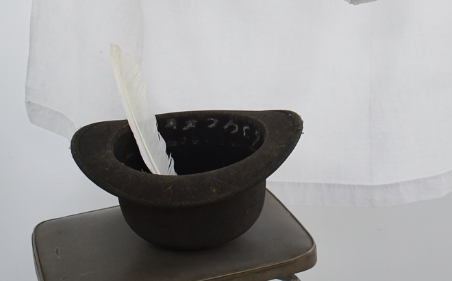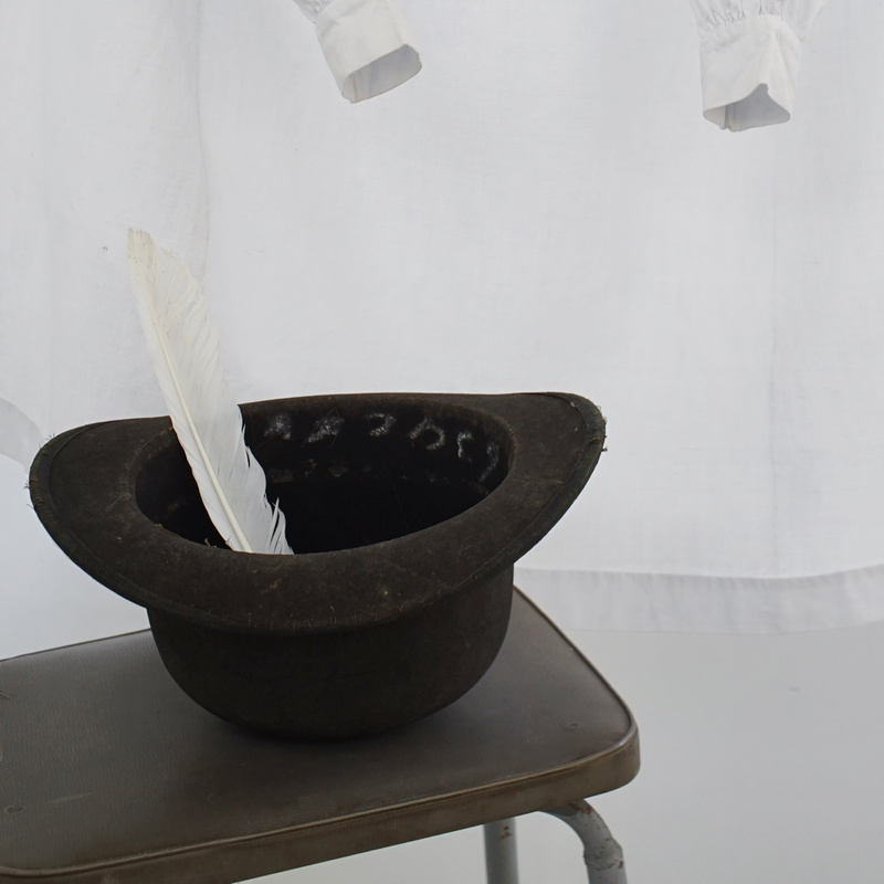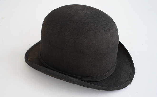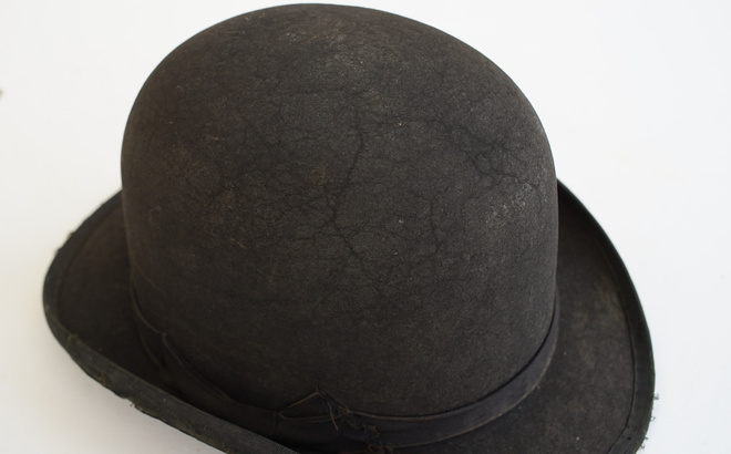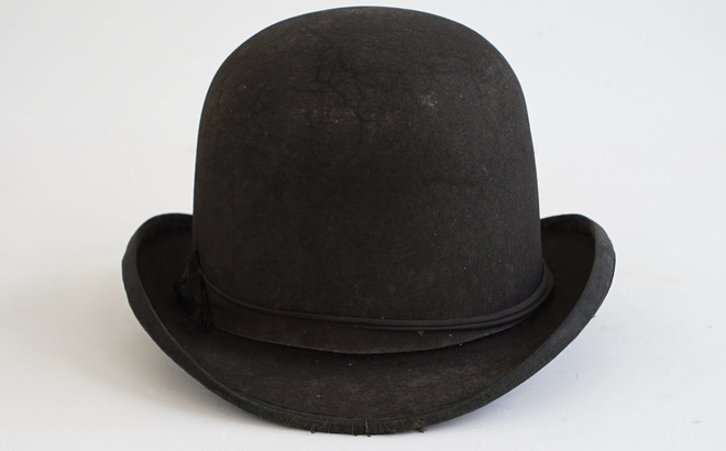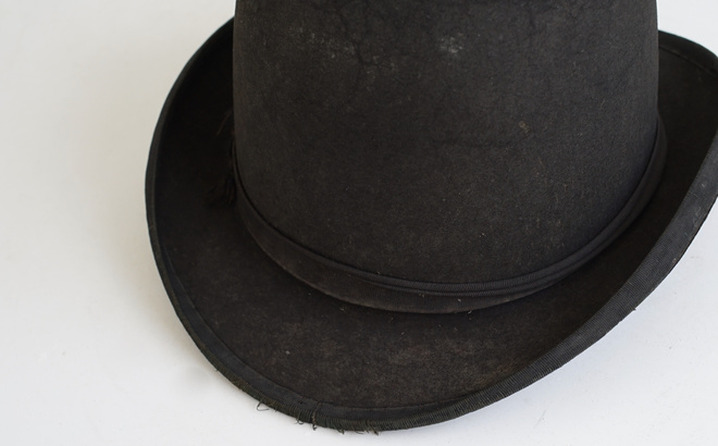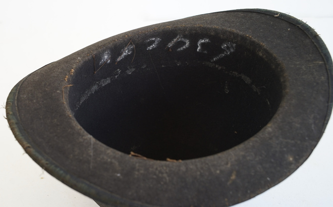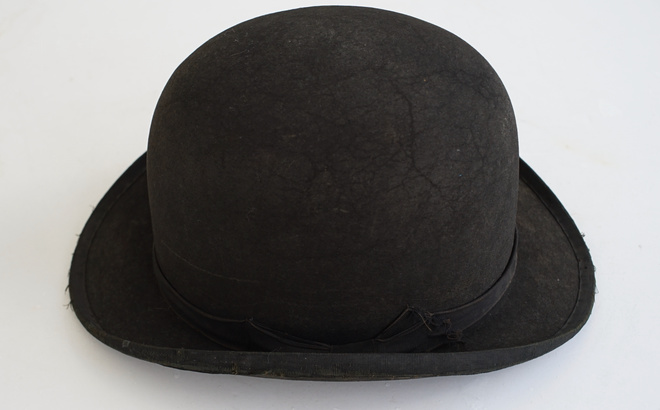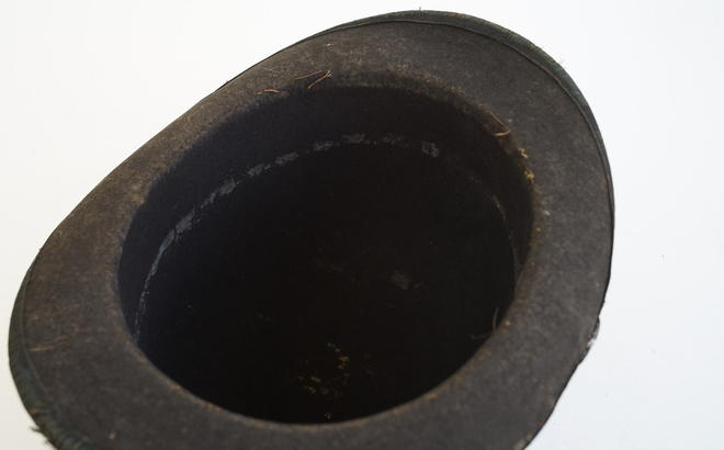 古い山高帽。雰囲気のある風合いが格好良くオブジェとして魅力的。内側に書かれた数字やアルファベットのような文字も魅力的なディテール。