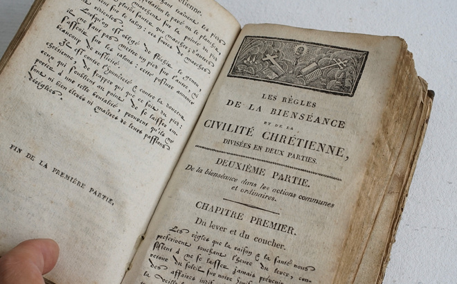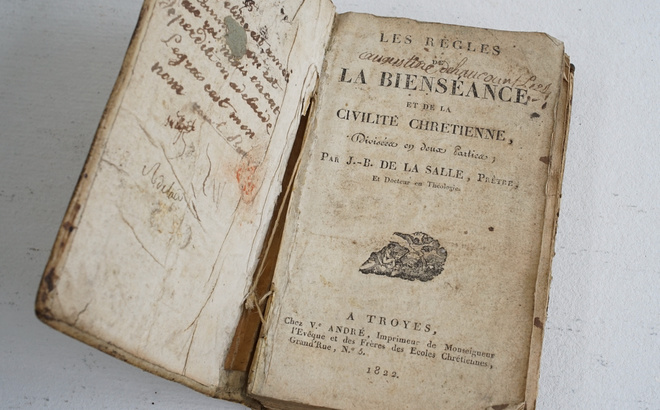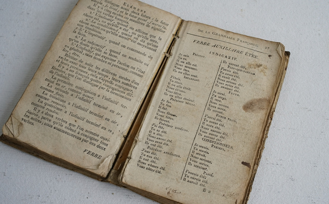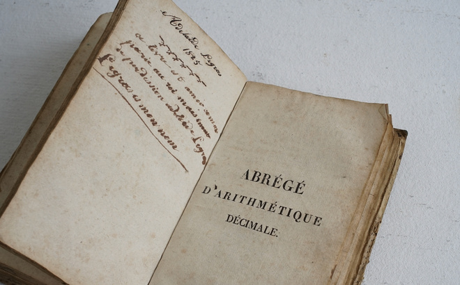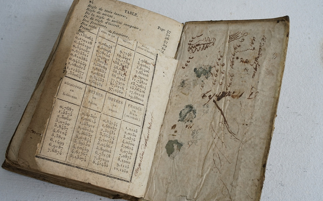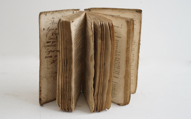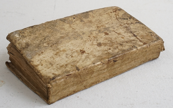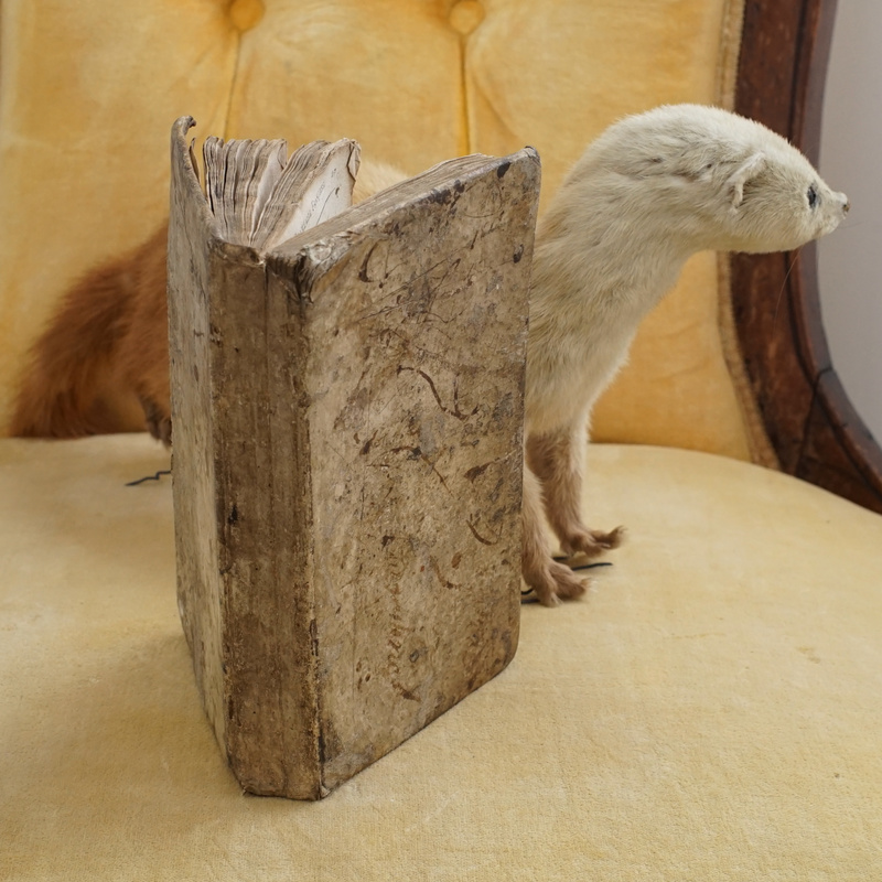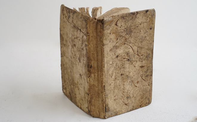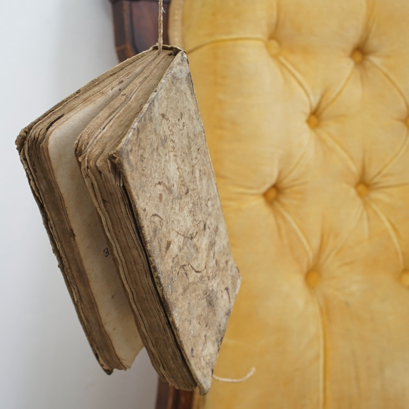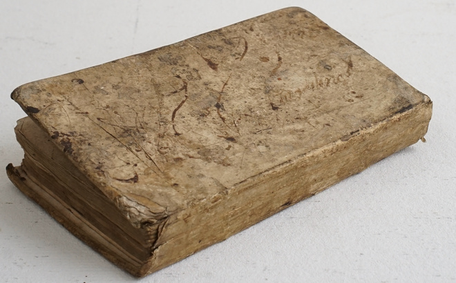 フランスで見つけた羊皮紙カバーの古書。カリグラフィも見える羊皮紙の表紙が味わい深く魅力的。