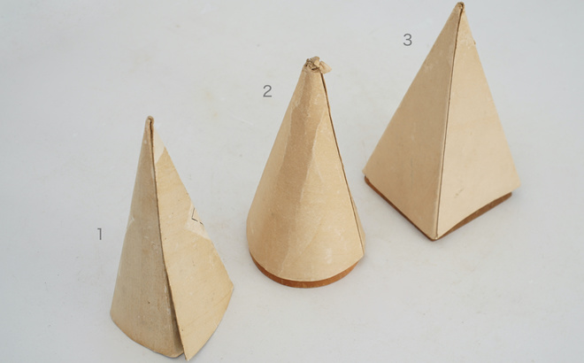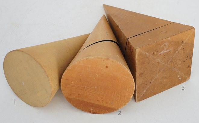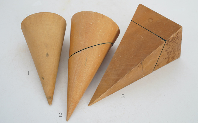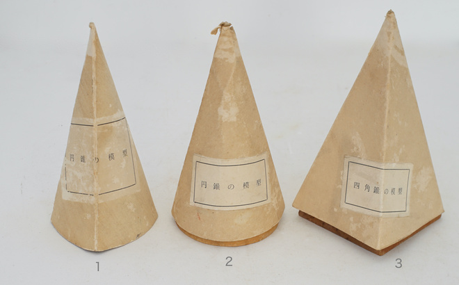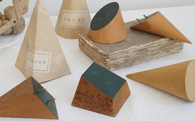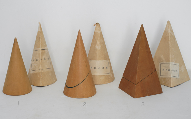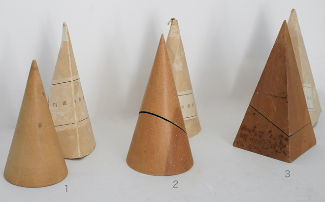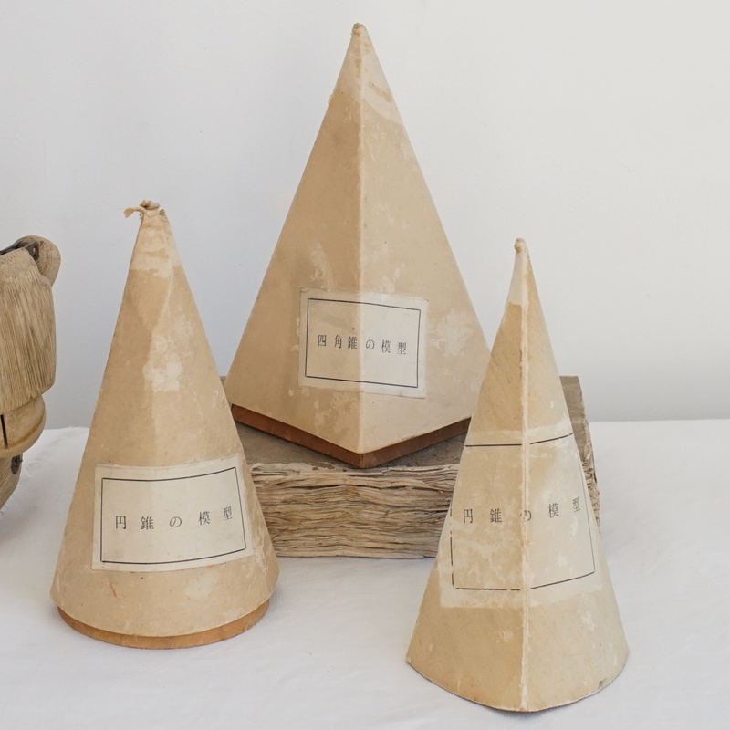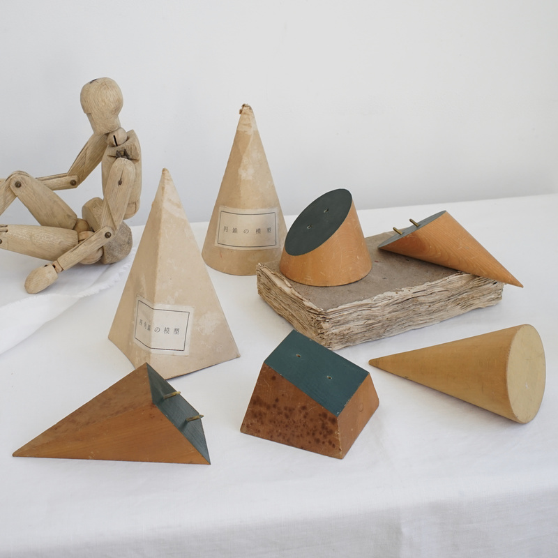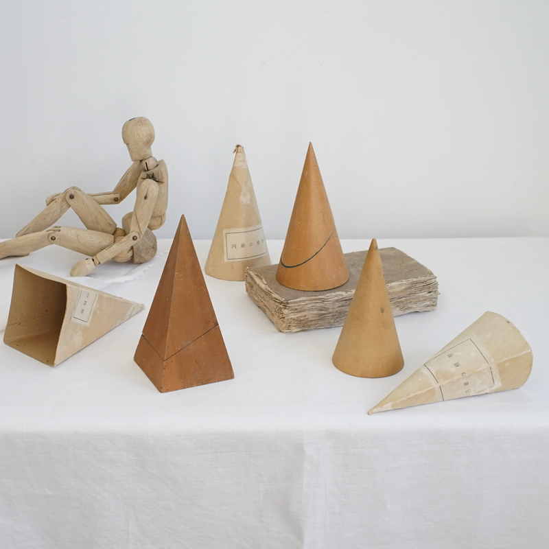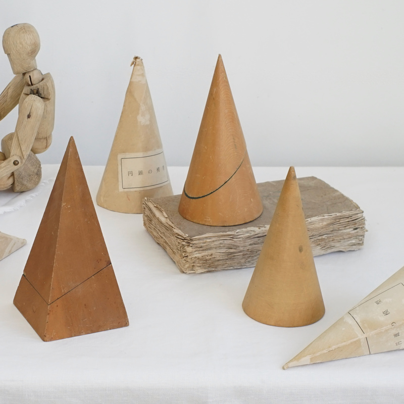 古い木製の幾何学模型、円錐の模型と四角錐の模型。幾何学オブジェは置いてあるだけで絵になるアイテム。