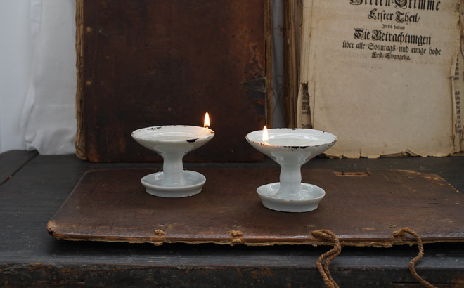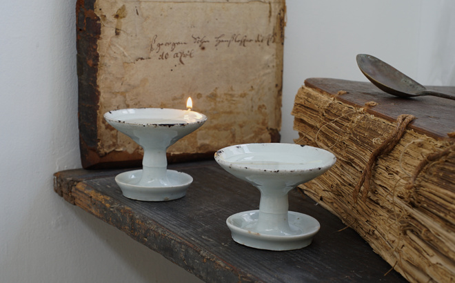 雰囲気のある白磁のオイルランプ、灯明皿。今回は受け皿が一体になったもの。