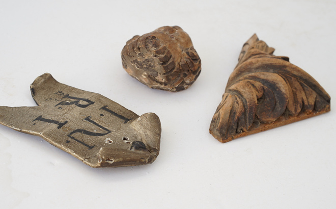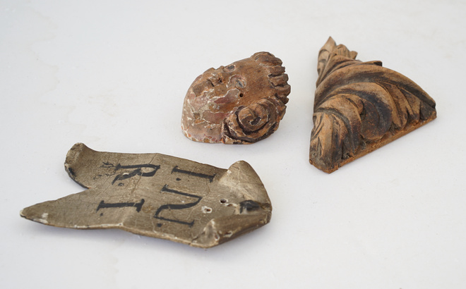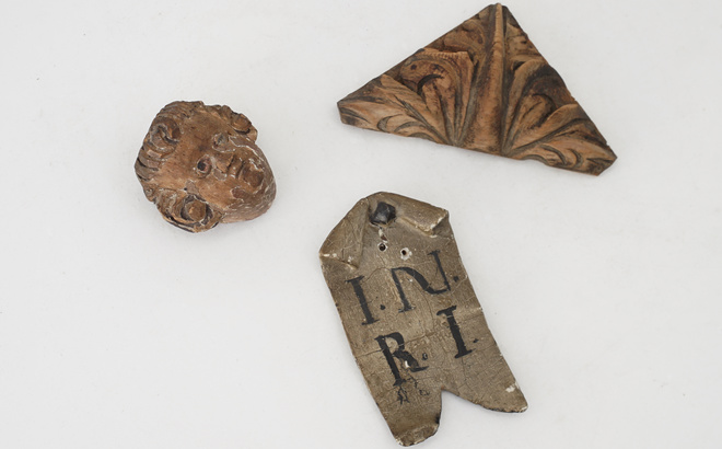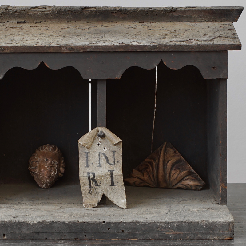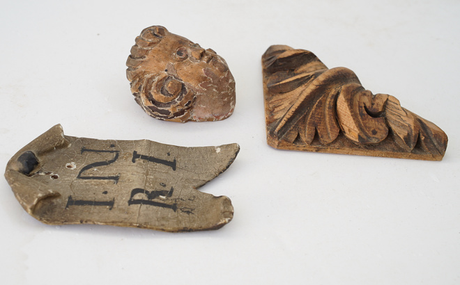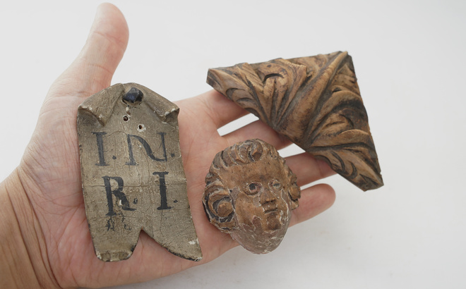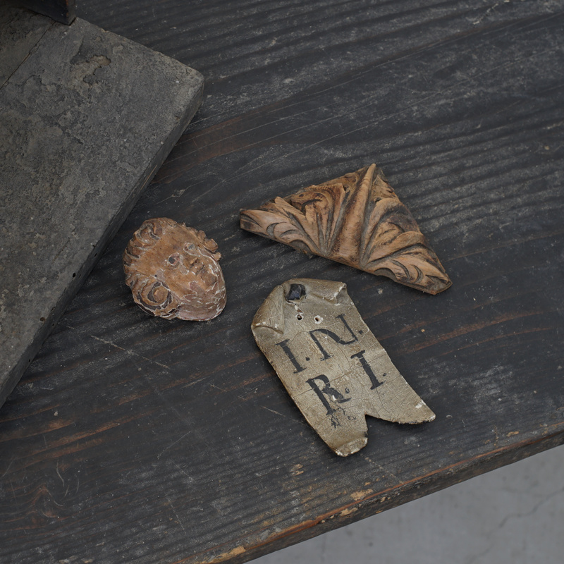 オランダの古い木製装飾セット。天使・聖人像のヘッド、INRI、三角形のレリーフ。