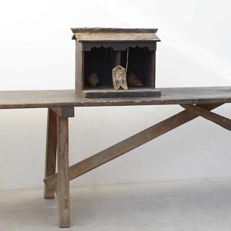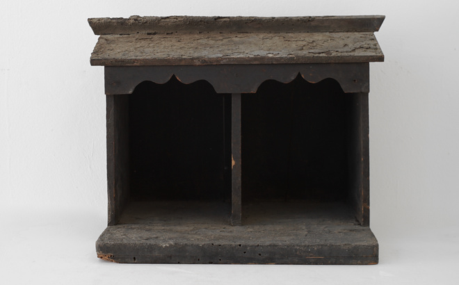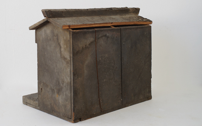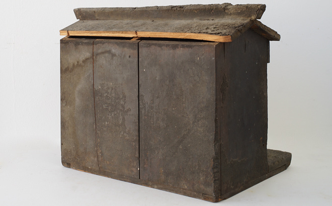 深い風合い、枯れた黒色が雰囲気のある厨子。左右のデザインも魅力的で厨子としてはもちろん、コレクションを飾って楽しみたい。