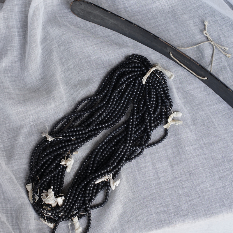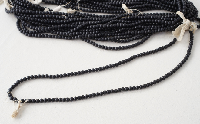 シックな黒色の古いビーズの束。見つけたままの状態で15本セット。ところどころに付いている小さなリボンのような紙も魅力的。