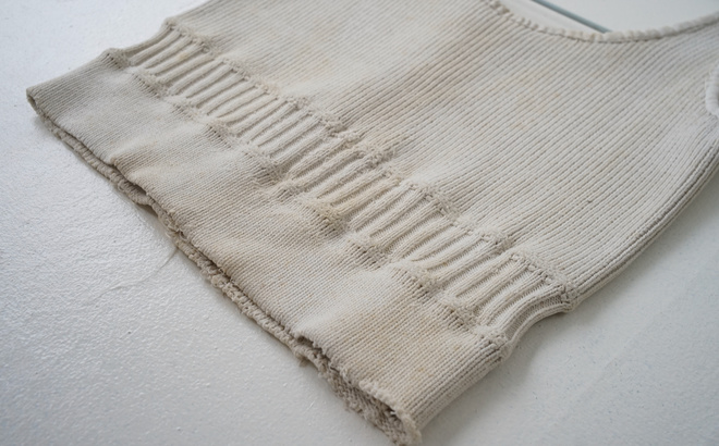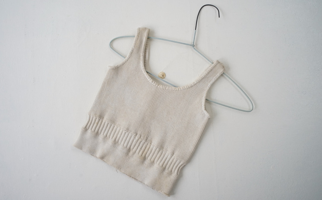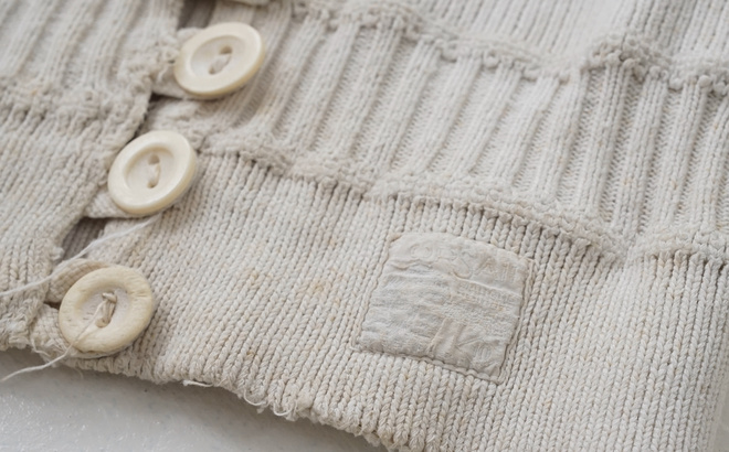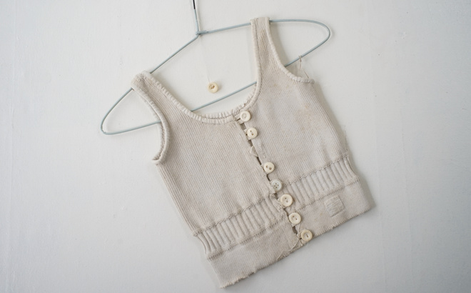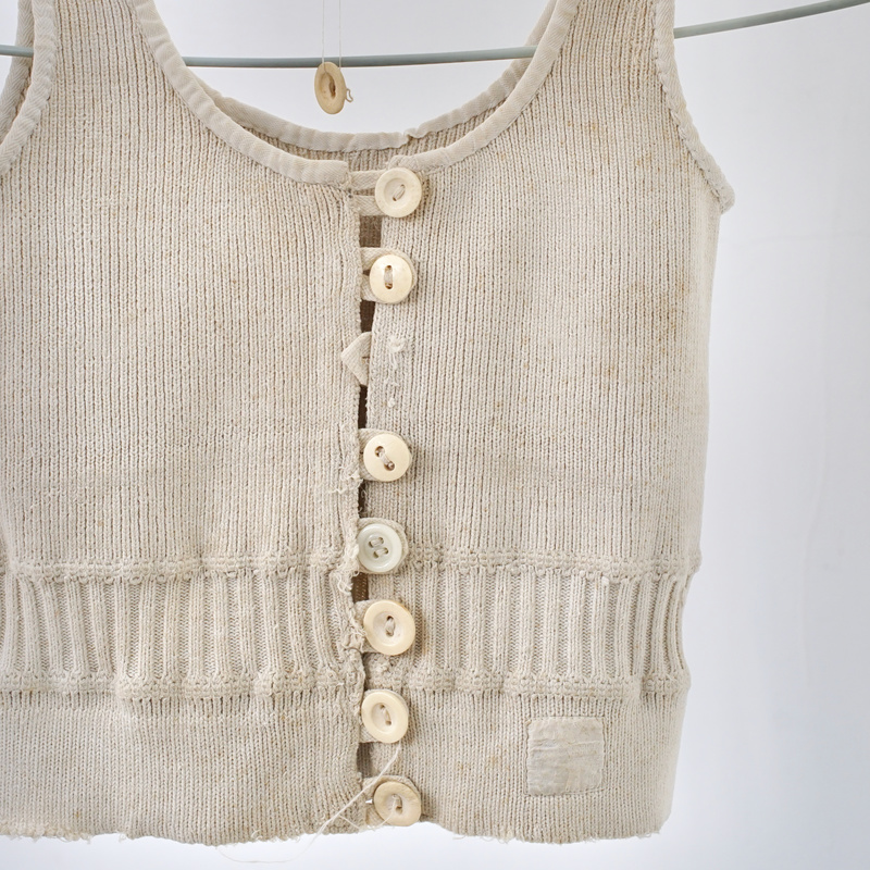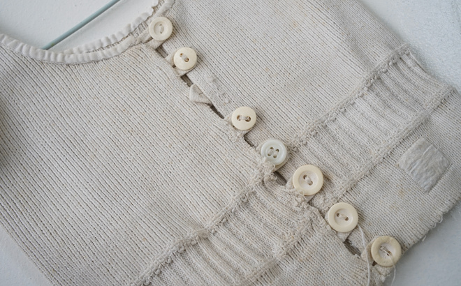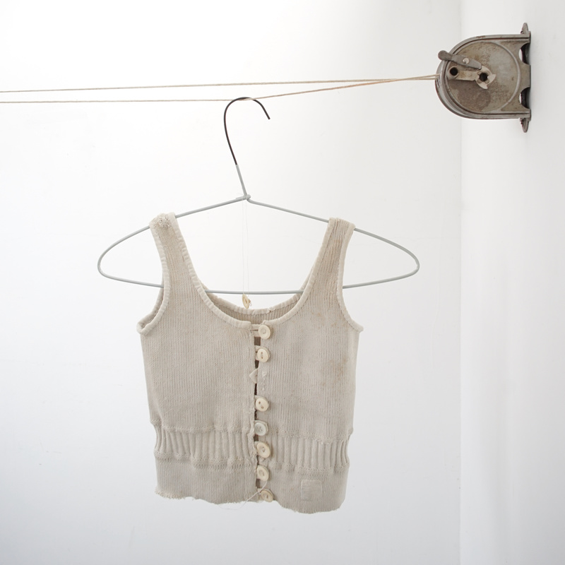 古い子供用トップス。コットンニットに雰囲気のある動物のツノやガラスボタンが並んだデザインが魅力的。