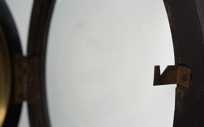 †電池交換、時刻合わせは文字盤裏のムーブメントで操作します。文字盤の周りのマイナスネジ3箇所を外すか、下のガラス扉の中から手を入れて電池交換等も可能です。