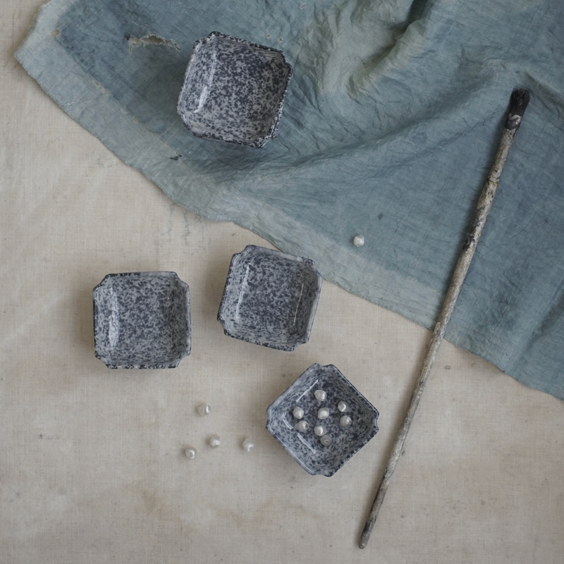 古い吹墨豆皿。落ち着きのあるグレイッシュなブルーが雰囲気が良く、詩的な水彩画のよう。側面の模様も雨や雪のようで綺麗。