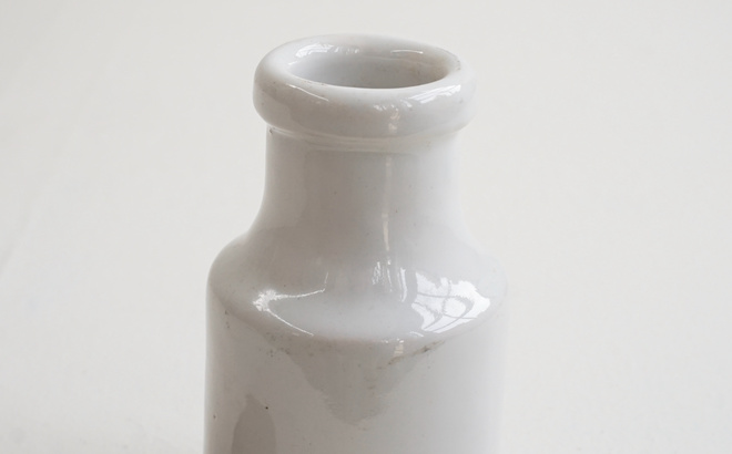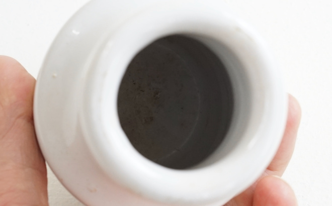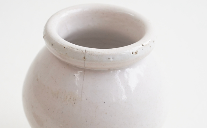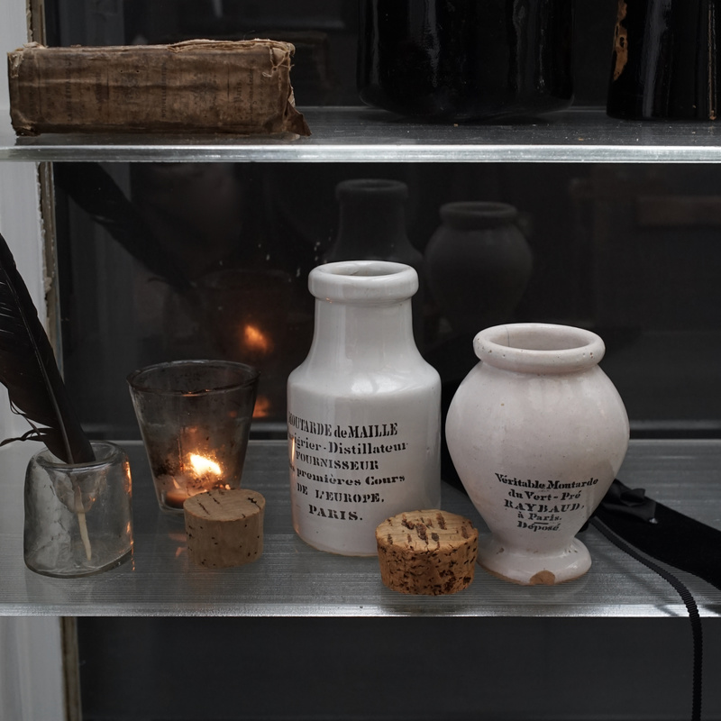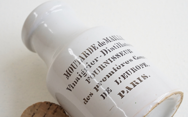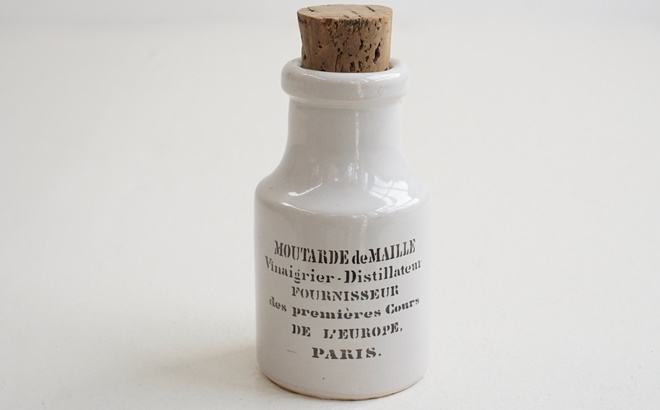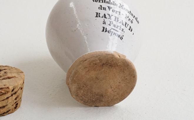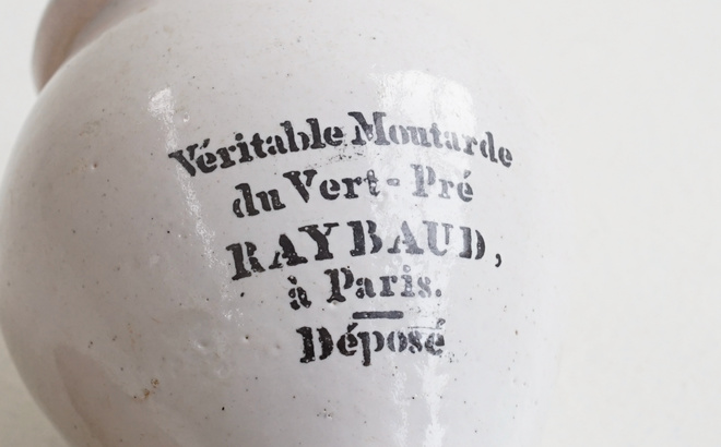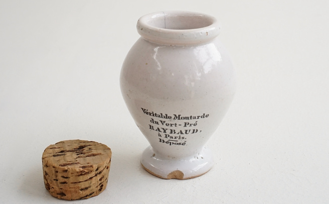 フランスの古いマスタードポット、1800年代と1900年代のもの。雰囲気のある釉薬に黒い文字が格好良い。