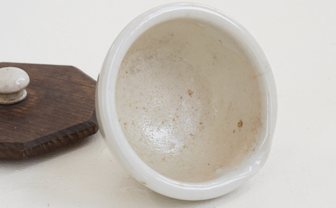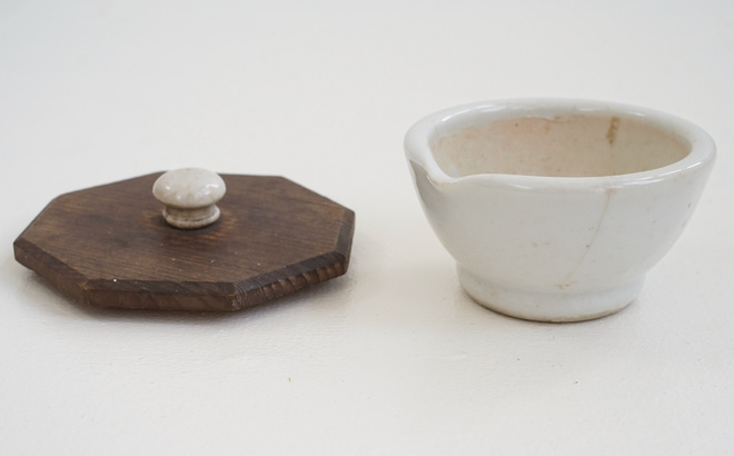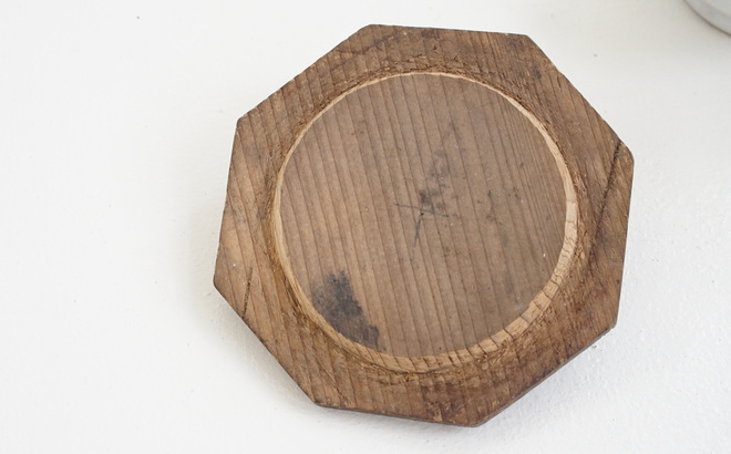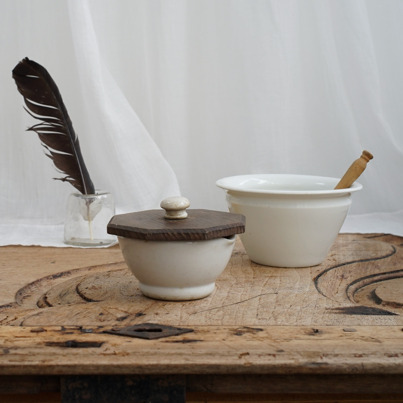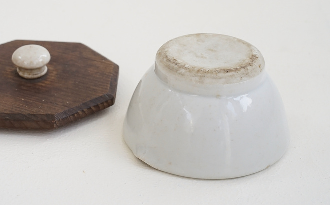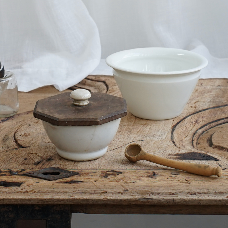 「 Porcelain Mortar 」 味のある白磁のつまみがついた八角形の木蓋付き、古い乳鉢。小さめサイズが可愛らしく印象的な絵になる佇まい。ポプリなどにも良いし、テーブルやキッチンで蓋付容器として楽しみたい。 CONTACT/ お問い合わせはこちら