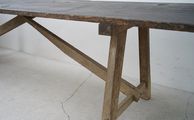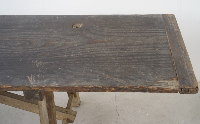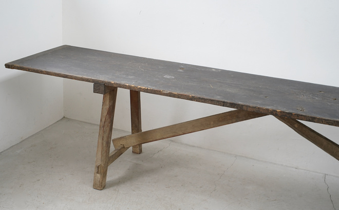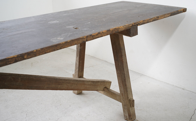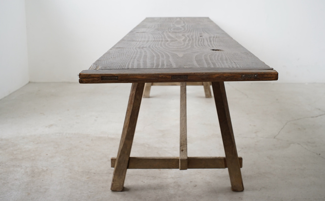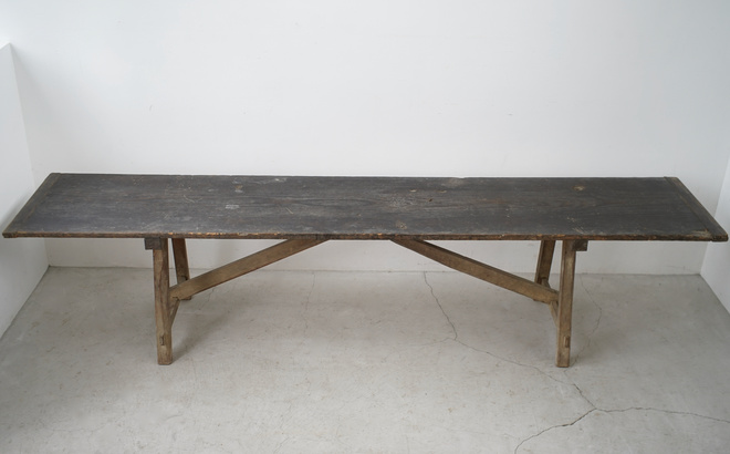雰囲気のある古い長テーブル。素朴でシンプルながら魅力的な作り、使い込まれた渋い黒めの天板も良い。